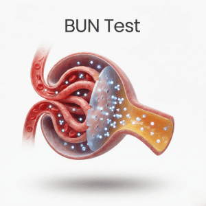 The BUN (Blood Urea Nitrogen) test measures the amount of urea nitrogen in your blood. Urea nitrogen is a waste product formed after the liver breaks down protein. Normally, waste products are filtered out of the blood by the kidneys and excreted in urine. High or low levels of BUN can indicate kidney dysfunction or other metabolic issues.